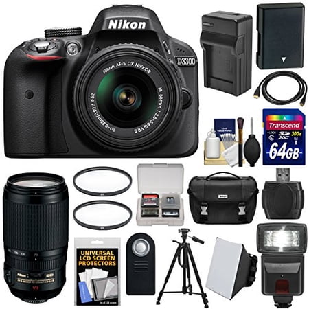 Nikon D3300 Digital SLR Camera & 18-55mm G VR DX II AF-S Zoom Lens (Black) with 70-300mm VR Lens + 64GB Card + Case + Fl