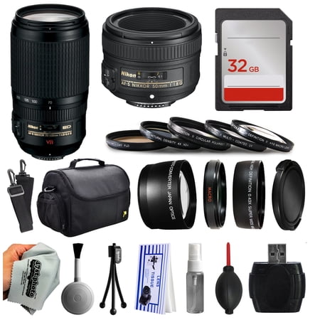 What's In The Box: Nikon AF-S VR Zoom-NIKKOR 70-300mm f\/4.5-5.6G IF-ED Lens (2161) Nikon 50mm f\/1.8G AF-S NIKKOR FX Lens (2199) 32GB High Speed Memory Card (Class 10) Professional 5 Piece Filter Kit (UV-CPL-FL-ND4-10x) Opteka 0.43x High Definition II Wide Angle LensOpteka 2.2x High Definition II Telephoto LensDeluxe Digital Camera Padded Carrying Case (Large) Extra Lens Protection CapHigh Speed SD\/SDHC\/Micro SD Reader\/WriterAir Dust BlowerSmall Mini Tabletop TripodLens Cleaning Kit$50 Promo Code for Digital Photo Prints47th Street Cleaning Cloth