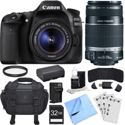 Bundle Includes Canon EOS 80D Camera Body Canon EF-S 18-55mm f\/3.5-5.6 IS STM Lens Canon EF-S 55-250mm f\/4-5.6 IS II (Stabilized) Telephoto Lens Compact Deluxe SLR Camera Bag 32GB SDHC High Speed Memory Card LP-E6 Battery Battery Charger for LP-E6 Battery 58mm Multicoated UV Protective Filter Card Reader Screen Protectors 3 Piece Cleaning Kit Memory Card Wallet Microfiber Cleaning Cloth Focus with Precision Whether raising your game to SLR level photography or having fun with a feature-rich, versatile SLR you can use pretty much anywhere, the EOS 80D camera is your answer