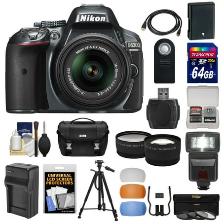 Nikon D5300 Digital SLR Camera & 18-55mm G VR DX II AF-S Lens (Grey) with 64GB Card + Battery + Charger + Case + Tripod + Flash + Tele\/Wide Lens Kit